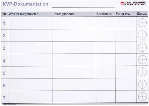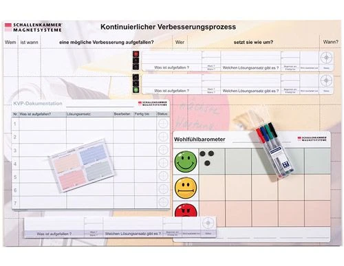 Die Produkte des Unternehmens Schallenkammer werden gerne bei KVP-Maßnahmen eingesetzt. Magnete eignen sich hervorragend zum Visualisieren im KVP-Prozess. Bei KVP-Maßnahmen sorgen sie für Transparenz, Markierungen und Informationen lassen sich mit Magnetprodukten direkt vor Ort auf Tafeln oder sogar an Maschinen befestigen.